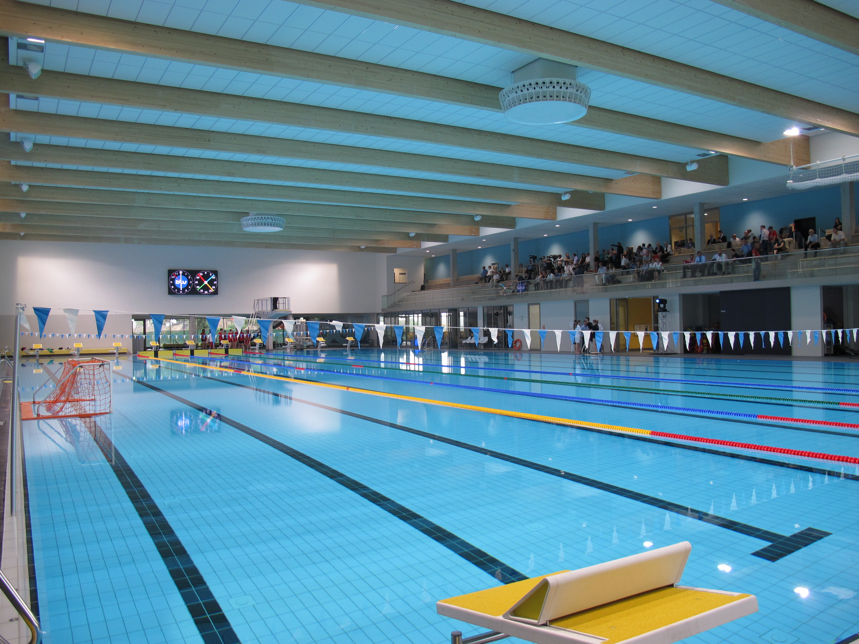 Nach einem interessanten Imagefilm über den Neubau, 3 sehr langen Reden vom Sprungturm und einer symbolischen Schlüsselübergabe starteten zunächst die Potsdamer Schwimmer eine