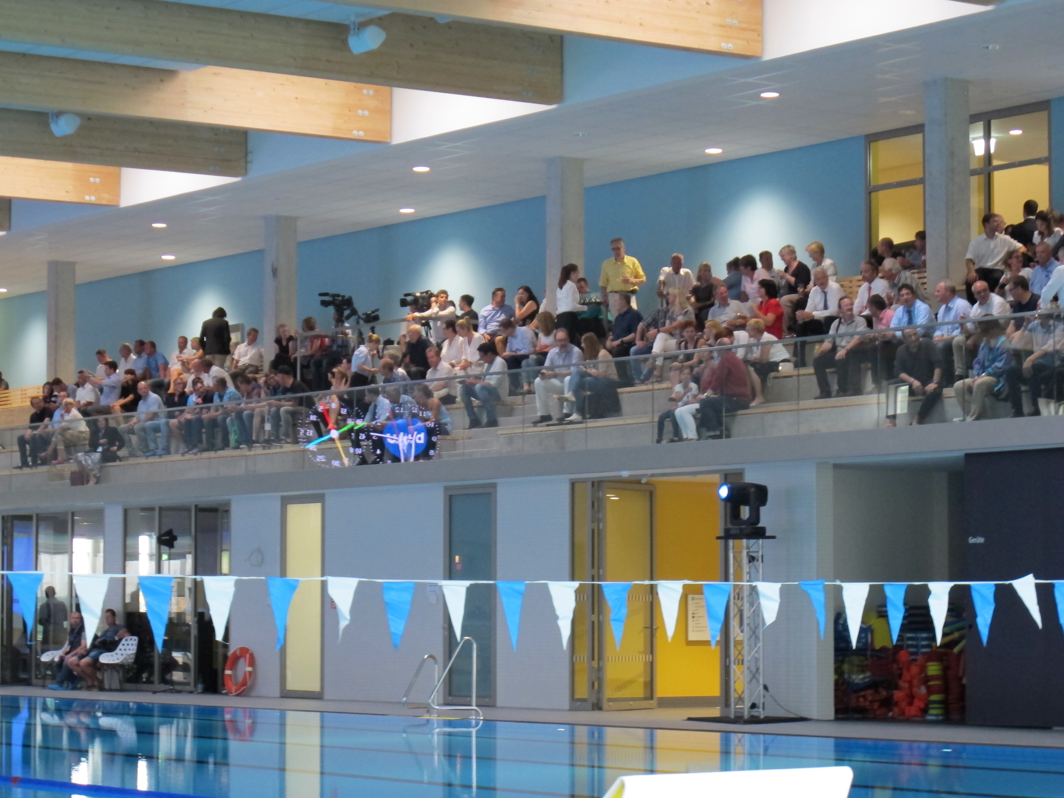 Nach einem interessanten Imagefilm über den Neubau, 3 sehr langen Reden vom Sprungturm und einer symbolischen Schlüsselübergabe starteten zunächst die Potsdamer Schwimmer eine