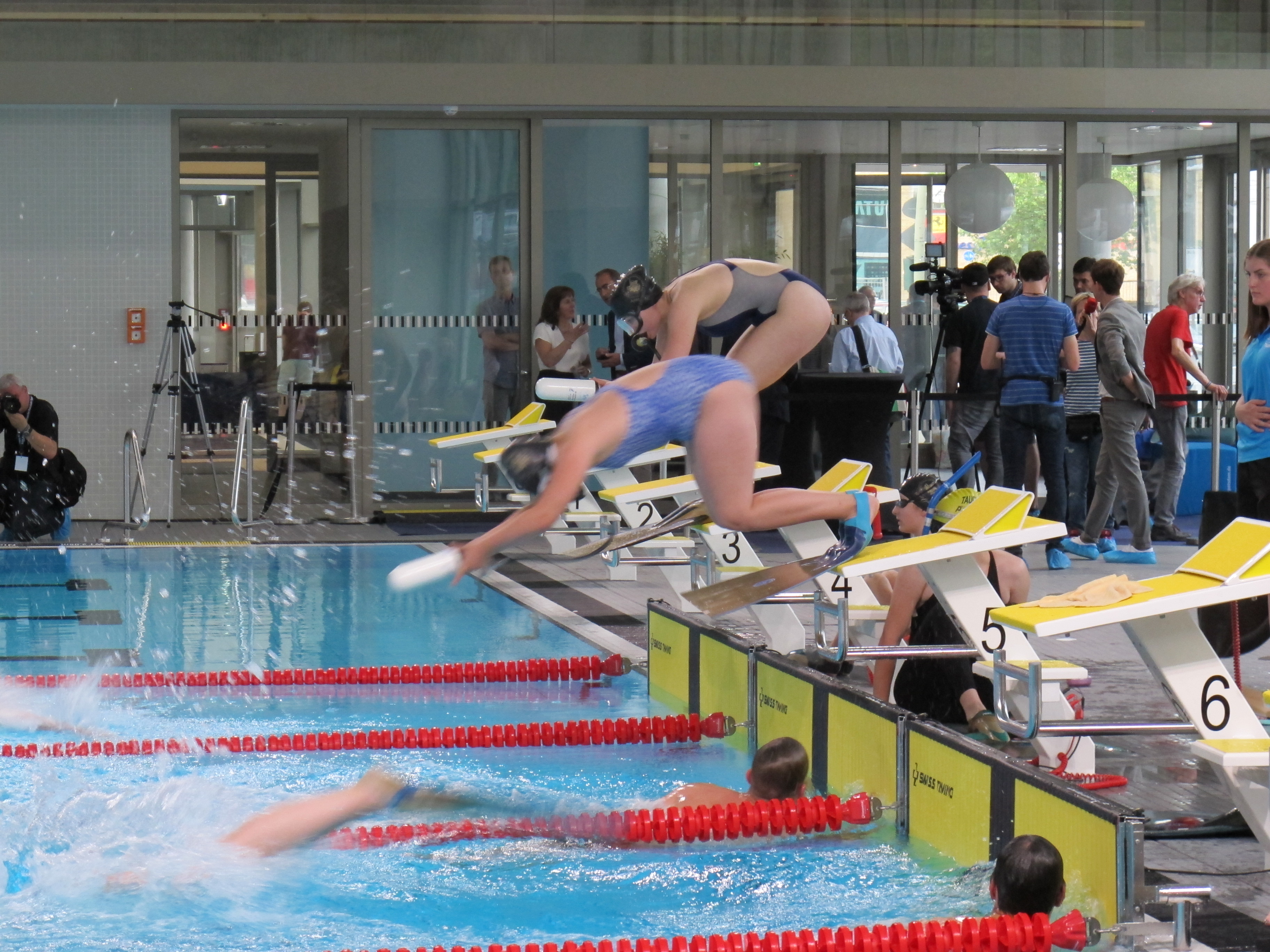 Nach einem interessanten Imagefilm über den Neubau, 3 sehr langen Reden vom Sprungturm und einer symbolischen Schlüsselübergabe starteten zunächst die Potsdamer Schwimmer eine